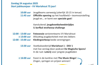 Lees meer »Op 1 juli 2026 viert Voetbalvereniging Mariahout een bijzondere mijlpaal: het 75-jarig bestaan van de club! Al driekwart eeuw vormt onze vereniging het sportieve hart van het dorp, waar jong en oud samenkomen om hun liefde voor voetbal te delen. De jubileumboek commissie is hard aan het wer...