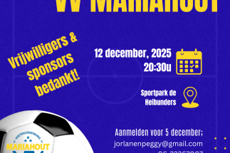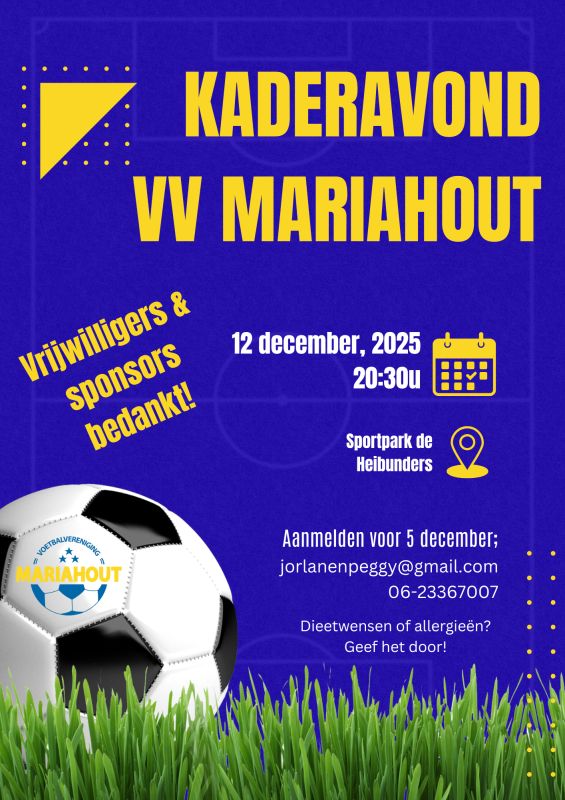 Elk jaar organiseert VV Mariahout een kaderavond om haar vrijwilligers en sponsors te bedanken voor wat zij allemaal doen voor onze vereniging. De kaderavond vindt plaats op vrijdag 12 december in onze kantine op sportpark de Heibunders, aanvang 20:30 uur. Alle genodigden krijgen binnenkort een uitnodiging, ook de partners zijn van harte welkom.