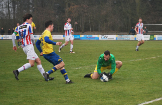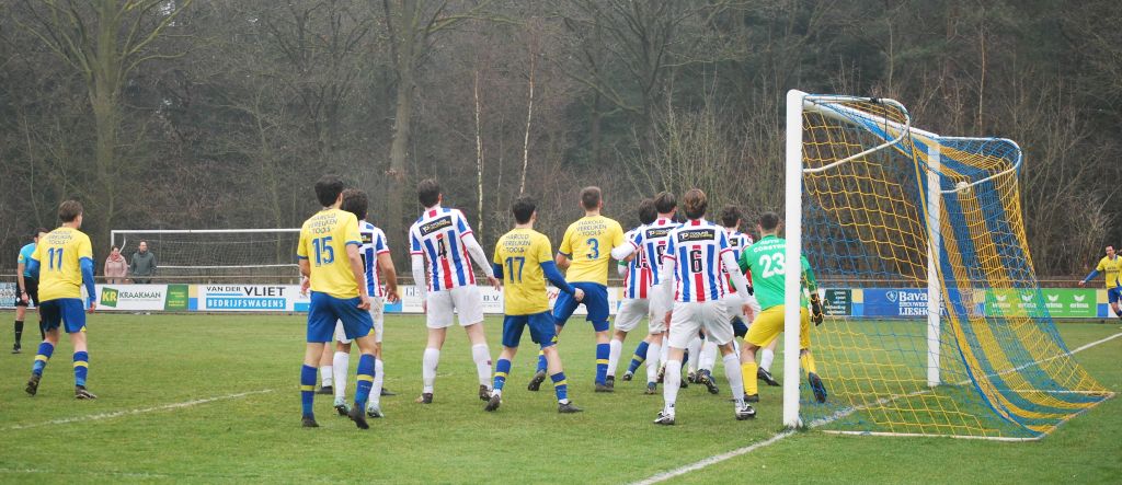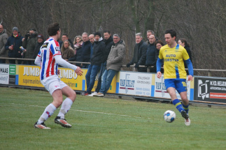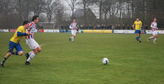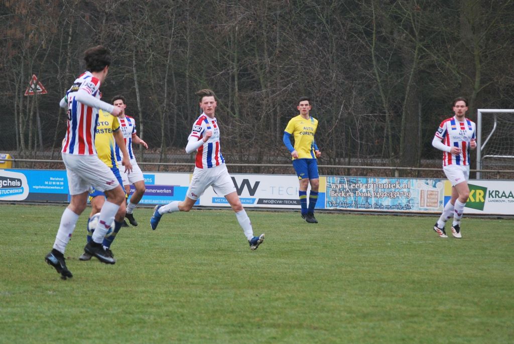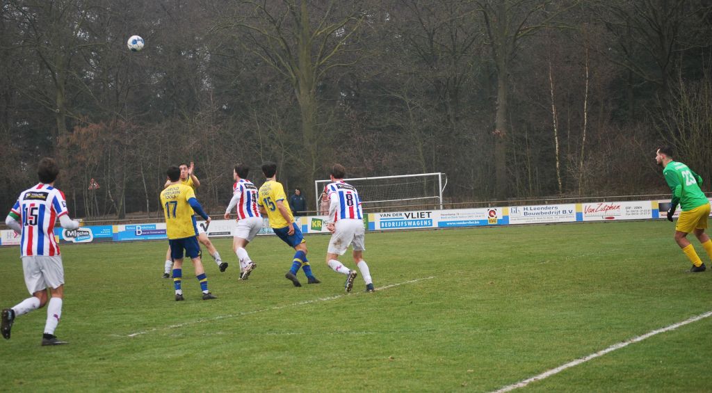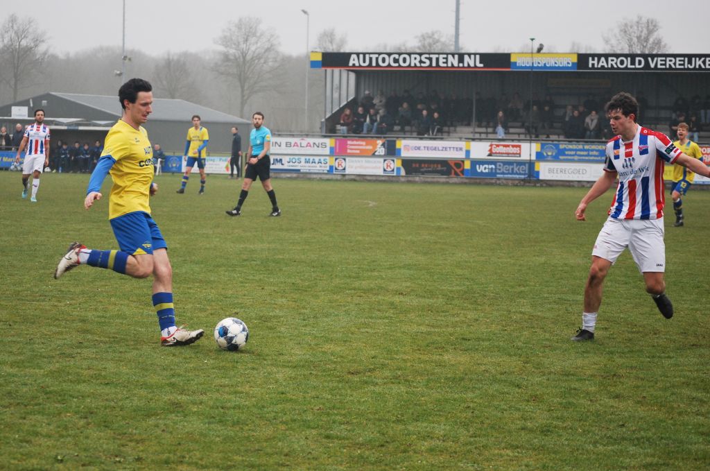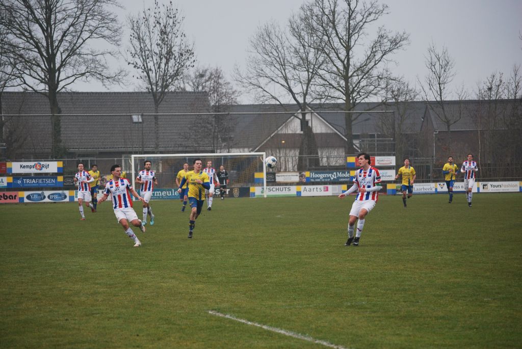 De eerste kans van de wedstrijd was voor Mariahout, de inzet van Pepijn Vroomans was echter een eenvoudige prooi voor de doelman. Daarna nam Stiphout met verzorgd spel het initiatief over en wist Mariahout terug te dringen. Na 10 minuten werd een steekbal door het hart van de defensie van Mariahout door Stijn de Kleine beheerst breed gelegd, waar Max Tersteeg de bal eenvoudig binnen kon schuiven: 0-1. Na 20 minuten kwam Mariahout beter in het spel, een schot van David van Rossum werd gekeerd door doelman Teun Strijbosch. In de 38e een vrije trap voor Mariahout: Joep van Hoof legde de bal op het hoofd van Tim Barten, die de bal over de keeper in het doel kopte: 1-1. Mariahout zette door, Pepijn Vroomans leek de bal in de uiterste hoek binnen te koppen, maar doelman Strijbosch bracht knap redding. In de voorlaatste minuut van de eerste helft nog een grote kans voor Mariahout, Sander Brugmans schoot de bal na een mooie aanval snoeihard tegen de lat.